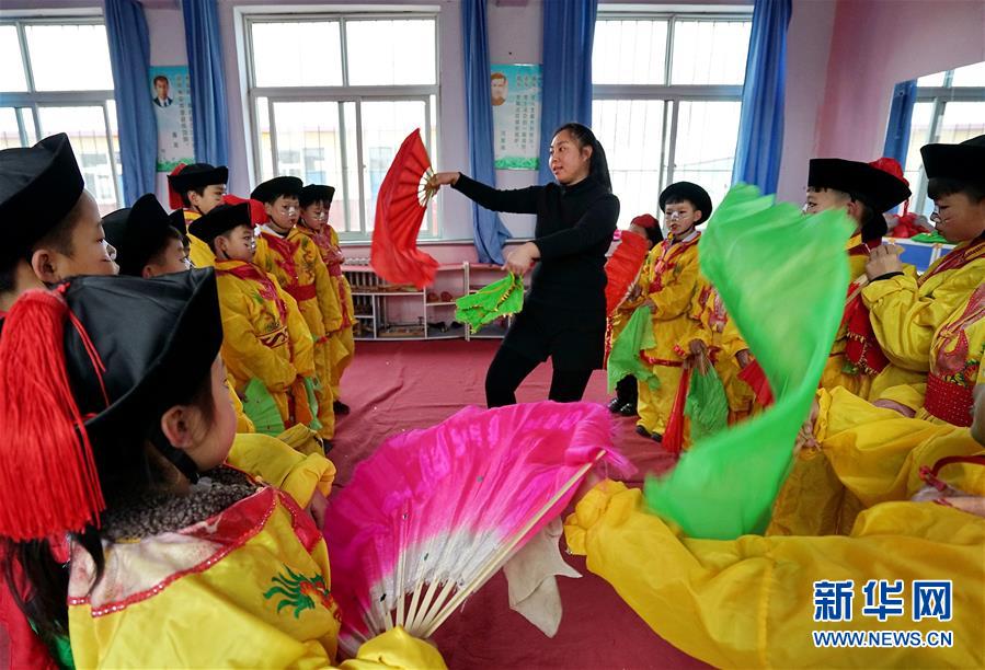 12月19日,河北省灤州市小閆營(yíng)小學(xué)教師在為學(xué)生示范地秧歌動(dòng)作要領(lǐng)。新華社記者 牟宇 攝