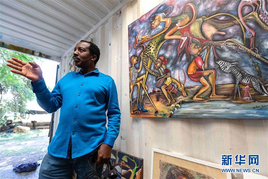 12月20日,在肯尼亞內(nèi)羅畢庫(kù)奧納藝術(shù)中心,一名畫(huà)家介紹自己的作品。 新華社記者 王騰 攝