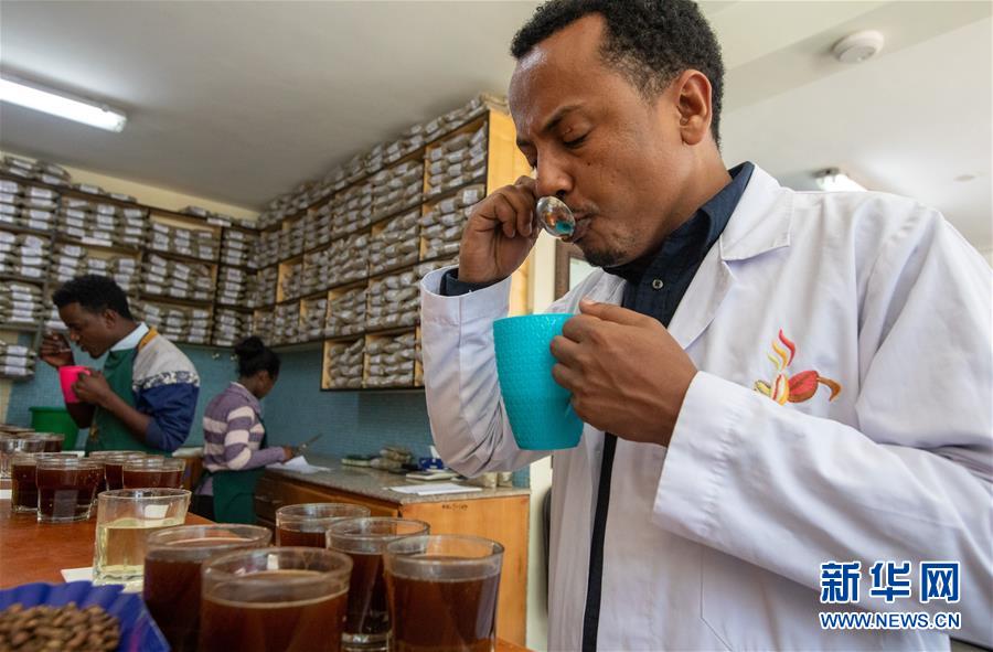 2019年10月23日,在位于埃塞俄比亞首都亞的斯亞貝巴郊外的卡辰什咖啡加工廠內(nèi),卡辰什咖啡質(zhì)量和市場總監(jiān)阿斯納克·卡薩在杯測室參與咖啡的杯測。卡辰什咖啡是埃塞俄比亞最大的咖啡生產(chǎn)商和出口商之一??ㄋ_表示,中國市場潛力巨大,埃塞俄比亞咖啡在中國市場的占有率不斷增長,進(jìn)博會對埃塞俄比亞咖啡出口商來說是一個很好的機會。 新華社記者 張宇 攝