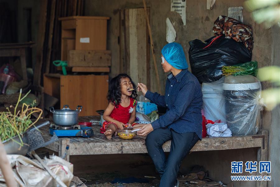 2019年3月15日,在柬埔寨磅湛,接受了白內(nèi)障手術(shù)的孫美樂回到住處給女兒喂飯。今年36歲的孫美樂是一位經(jīng)濟(jì)貧困的單身母親,和小女兒租住在一間簡陋的小屋里。她的左眼因白內(nèi)障幾近失明,無法繼續(xù)工作。在中國醫(yī)生到磅湛開展義診期間,她接受了廣西醫(yī)科大學(xué)第一附屬醫(yī)院梁皓醫(yī)生實(shí)施的白內(nèi)障手術(shù),術(shù)后一天她的左眼即恢復(fù)視物。 新華社記者 朱煒 攝