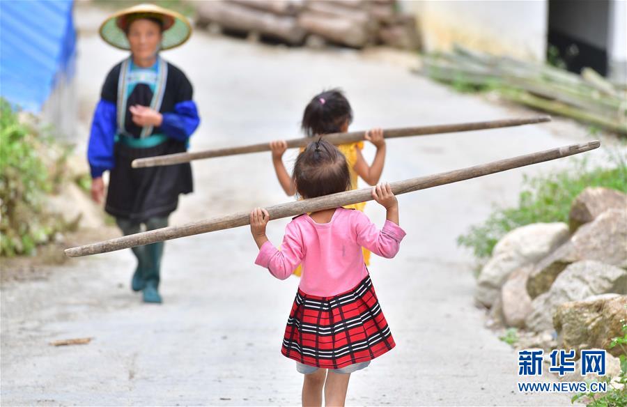 烏英苗寨的兩名小朋友幫大人拿扁擔(dān)回家(9月2日攝)。新華社記者黃孝邦攝