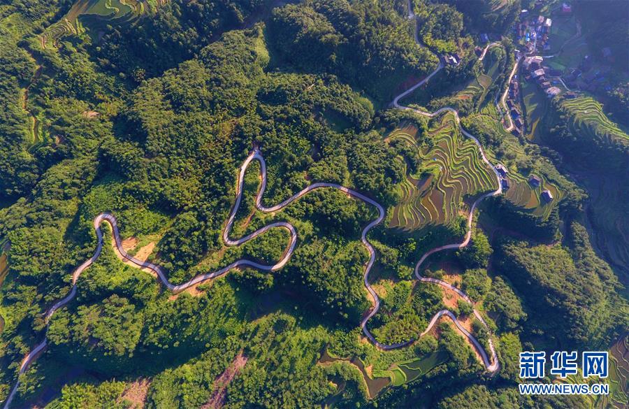 這是融水苗族自治縣桿洞鄉(xiāng)歸江村的村屯公路(6月19日無(wú)人機(jī)拍攝)。新華社記者黃孝邦攝