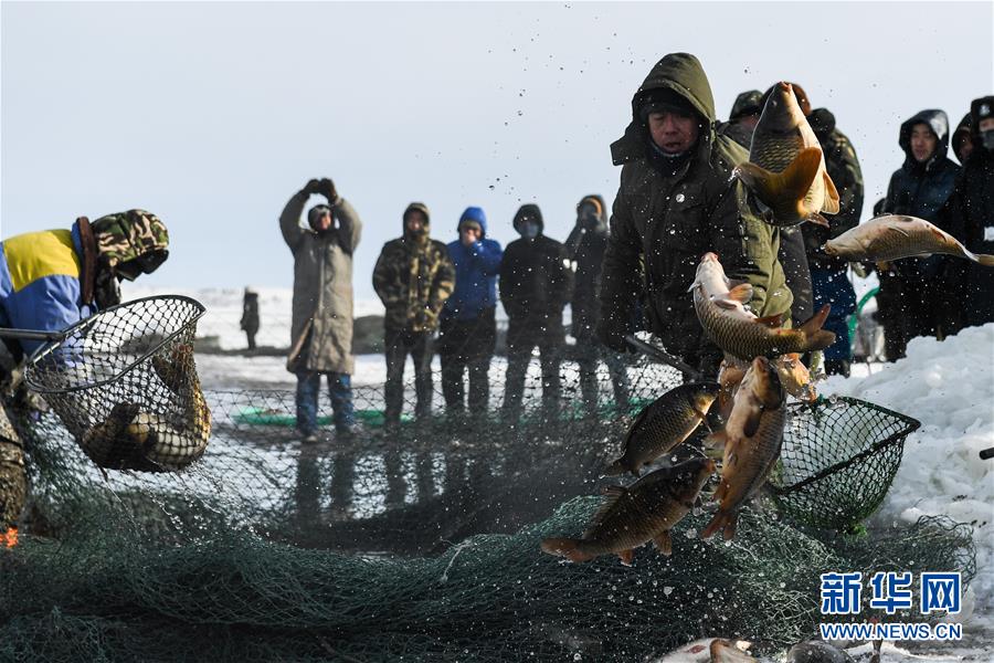 12月18日,工作人員將冬捕魚打撈上岸。當日,位于內蒙古呼倫貝爾大草原上的諾干湖舉行冬捕活動,吸引不少游客前來觀看。冬日的諾干湖冰雪覆蓋,諾干湖冬捕也是當地冬季旅游的特色活動之一。新華社記者劉磊攝