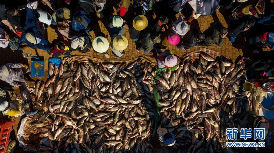 12月25日,人們?cè)谛窃坪系睦虾泳佐~(yú)市選購(gòu)剛捕撈的鮮魚(yú)(無(wú)人機(jī)拍攝)。新華社記者胡超攝