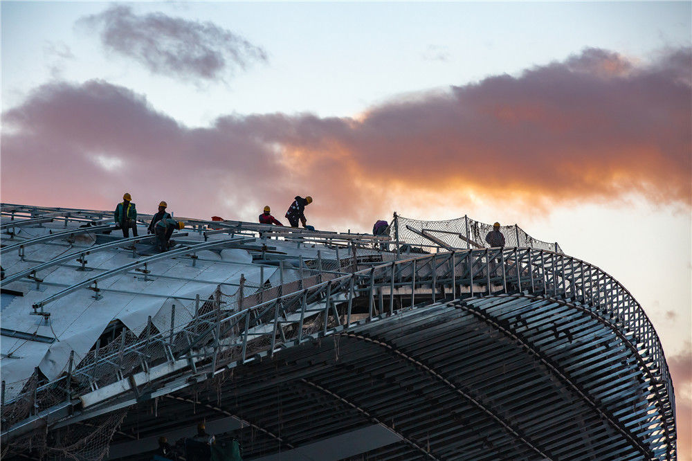 2019年1月13日,北京大興機場航站樓頂部最中央,一個工人正在進行驗收工作。陳國亨/視覺中國