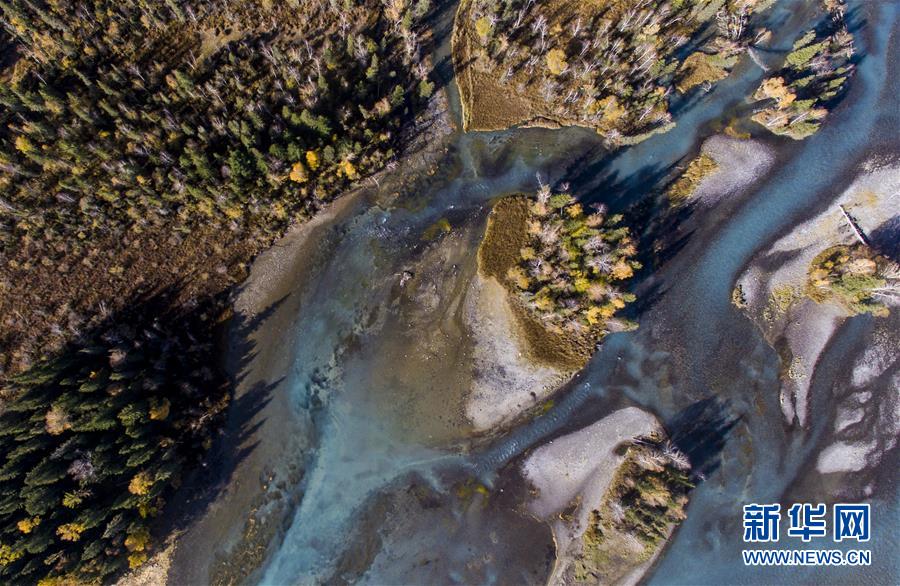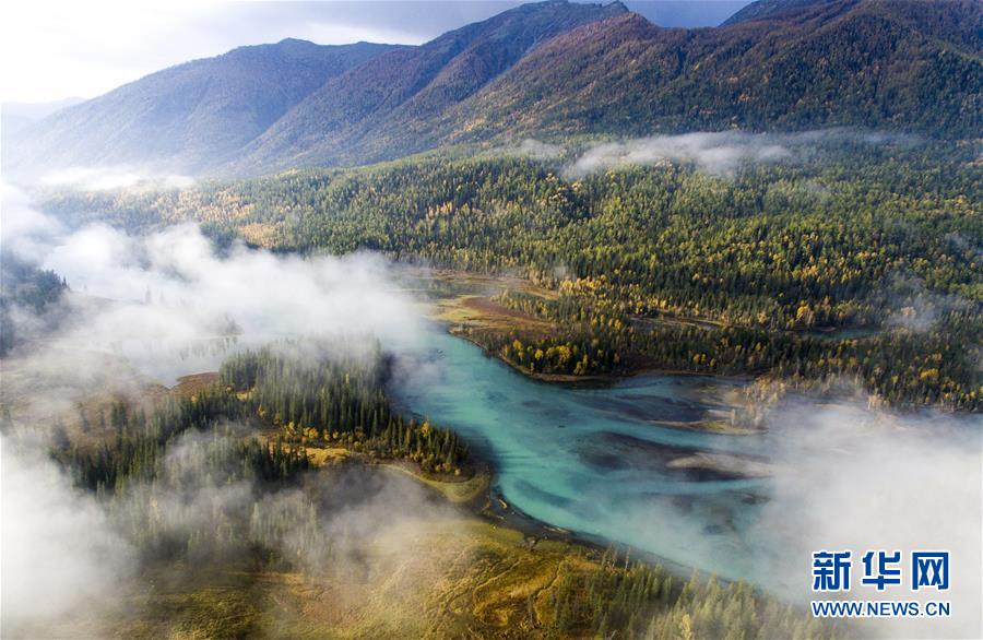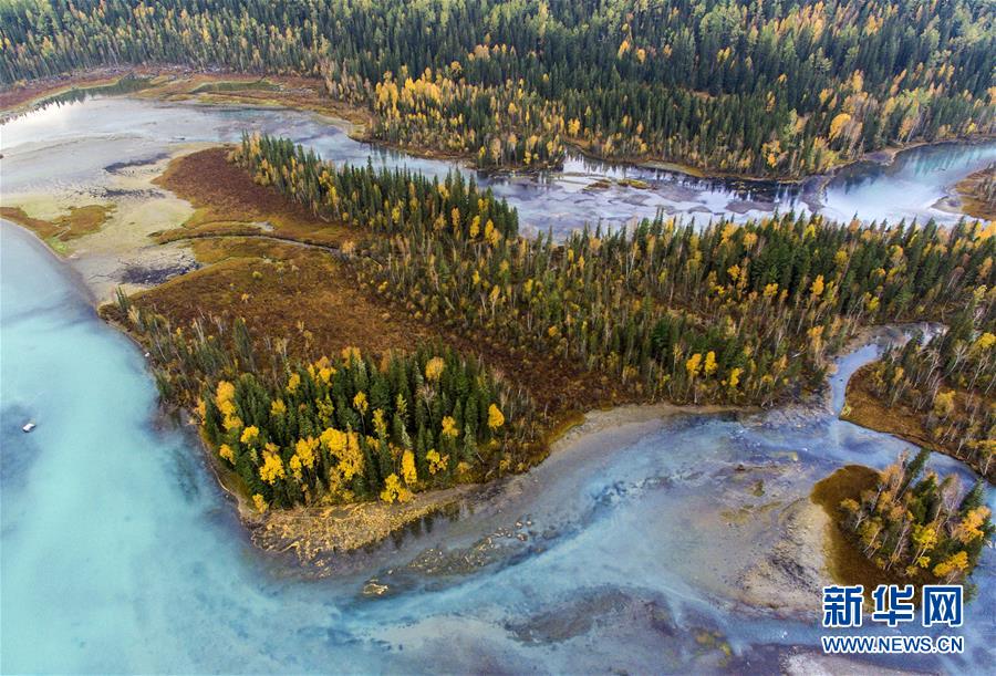 9月25日無人機拍攝的喀納斯景區(qū)風光。新華社記者王菲攝