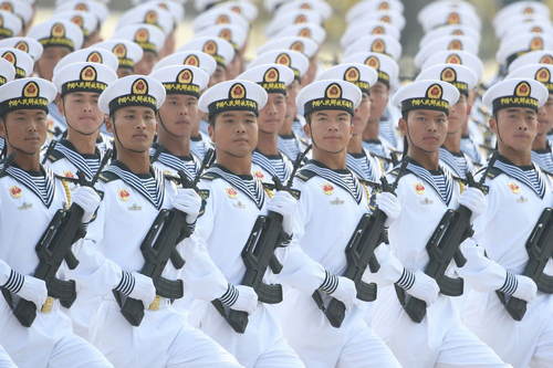 2019年10月1日,慶祝中華人民共和國成立70周年大會(huì)在北京天安門廣場(chǎng)隆重舉行。這是海軍方隊(duì)接受檢閱。新華社記者劉大偉攝