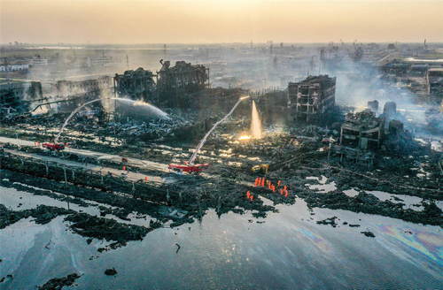 2019年3月23日拍攝的江蘇省鹽城市響水縣天嘉宜化工有限公司“3·21”特別重大爆炸事故現(xiàn)場(chǎng)(無人機(jī)照片)。新華社記者李博攝