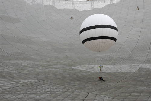 2019年8月30日,在貴州省平塘縣,“微重力蜘蛛人”在500米口徑球面射電望遠鏡(FAST)上進行首次巡檢實驗。FAST調試組于2017年底開始研制“微重力蜘蛛人”,該方案使用一個直徑7.6米的氦氣球將作業(yè)人員體重減少到FAST反射面板能夠承受的重量,使作業(yè)者能夠到達望遠鏡反射面任意地方執(zhí)行巡檢和維護作業(yè)。新華社記者歐東衢攝