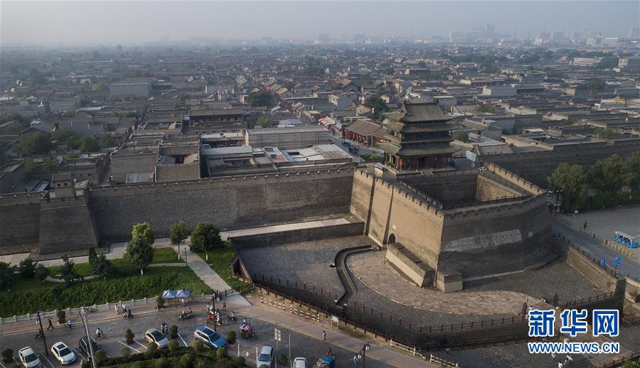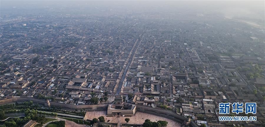 這是7月20日無(wú)人機(jī)從南門拍攝的平遙古城全景。鳥瞰平遙古城,形同一只欲行未動(dòng)的烏龜,“龜”頭南尾北,上下東西四門比擬為龜之四足,故有“龜城”之說(shuō)。