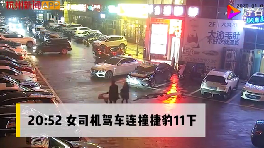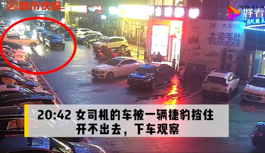 通過監(jiān)控發(fā)現(xiàn),捷豹車當(dāng)時并沒有停在停車位上,而是橫著停在停車位前的通道上,正好擋住了停在停車位里面的車輛。晚上8點40左右,一輛白色豐田普拉多越野車被捷豹擋住無法出去,10多分鐘后,司機(jī)通過倒車再加速十幾次撞擊捷豹,最終把車輛撞開后駛離現(xiàn)場。