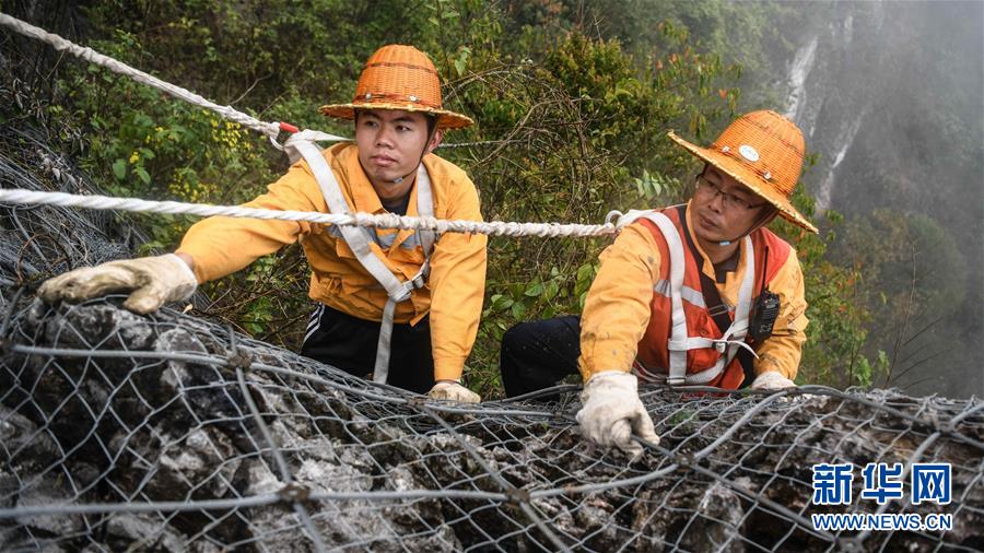 1月14日,百色工務(wù)段白水河橋隧工區(qū)班組工長王勇(右一)和同事在處理危石。在中國鐵路南寧局集團(tuán)公司百色工務(wù)段白水河橋隧工區(qū),有一個(gè)由14名工人組成的班組。他們常年像“爬山虎”一樣行走攀爬在地形險(xiǎn)峻、云霧繚繞的高山上,負(fù)責(zé)南昆鐵路轄區(qū)路段的搜山掃石工作,清除一切可能危害鐵路行車安全的因素,保障旅客出行安全。新華社記者張愛林?jǐn)z