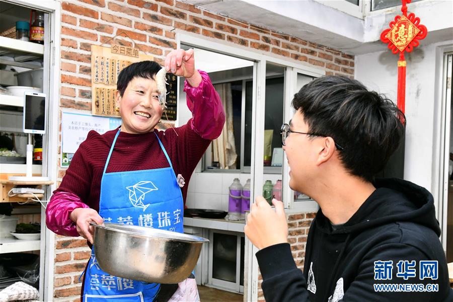 在榮成市煙墩角村,于海洋的母親向就餐的游客展示食材(1月12日攝)。新華社記者 王凱 攝