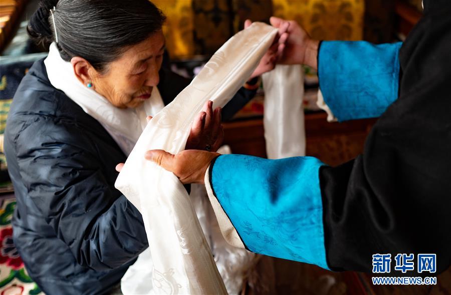 一名藏族群眾給長(zhǎng)輩敬獻(xiàn)哈達(dá),祝福長(zhǎng)壽(2月24日攝)。 新華社記者 普布扎西 攝