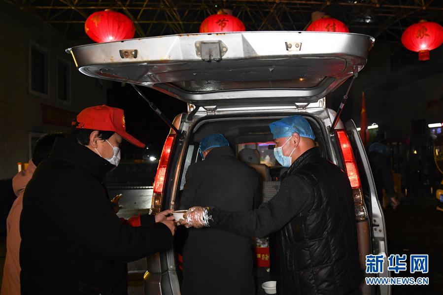 2月29日晚,侄子張士洋(右一)將張?zhí)m英做好的宵夜送給疫情防控人員。新華社記者張端攝