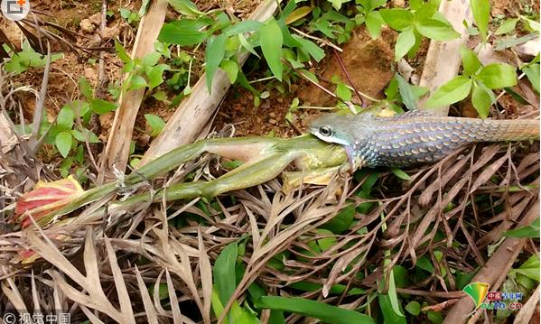 2018年7月18日,廣東東莞,藍(lán)綠鵲與蛇的地盤(pán)爭(zhēng)斗。