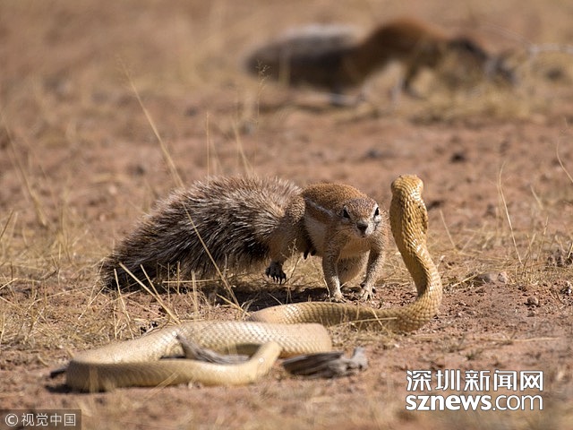 當(dāng)?shù)貢r(shí)間2016年10月25日,南非博茨瓦納的卡格拉格帝越界公園,眼鏡蛇和地松鼠之間發(fā)生激烈打斗,但都沒(méi)有受傷。野生動(dòng)物攝影師Hannes Rossouw拍攝了這一過(guò)程。