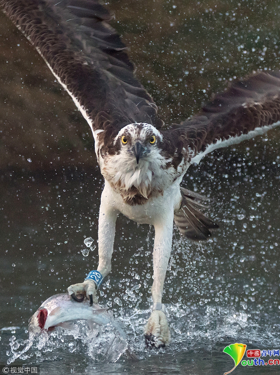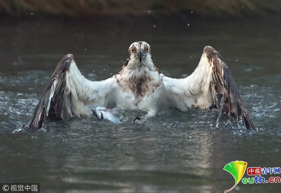 一只魚(yú)鷹潛入湖中捉鱒魚(yú),激起巨大的水花。圖片作者/視覺(jué)中國(guó)