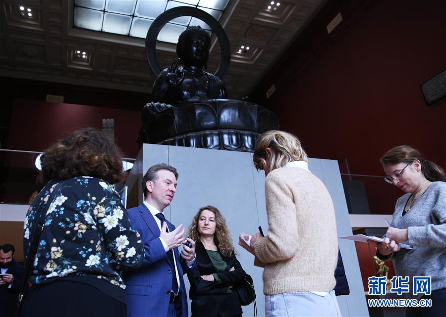 3月2日,在法國(guó)巴黎,賽努奇亞洲藝術(shù)博物館館長(zhǎng)埃里克·勒菲弗(左二)接受媒體采訪。  新華社記者 高靜 攝