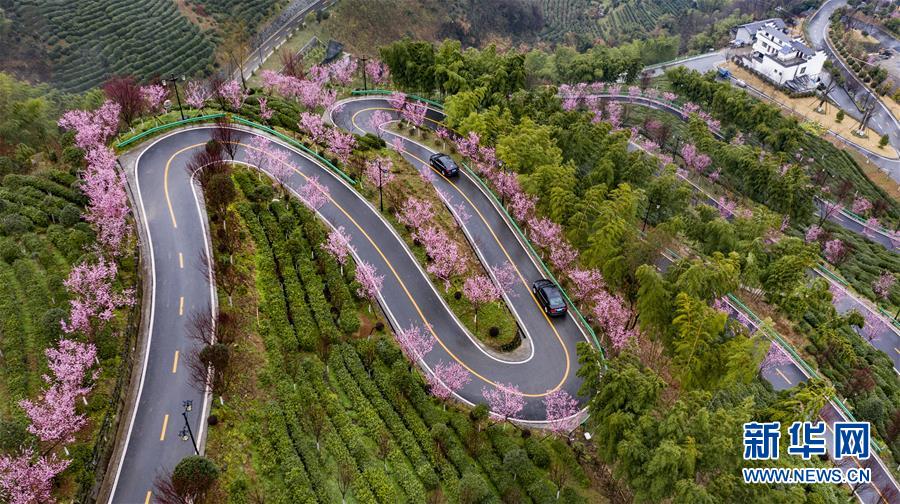 這是3月2日拍攝的平利縣長(zhǎng)安鎮(zhèn)洪福茶山,道路兩旁的春梅盛開(kāi)(無(wú)人機(jī)照片)。新華社記者陶明攝