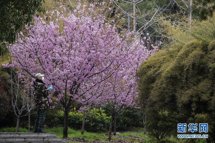 3月3日,一名工作人員在觀賞盛開的櫻花。 新華社記者 費(fèi)茂華 攝