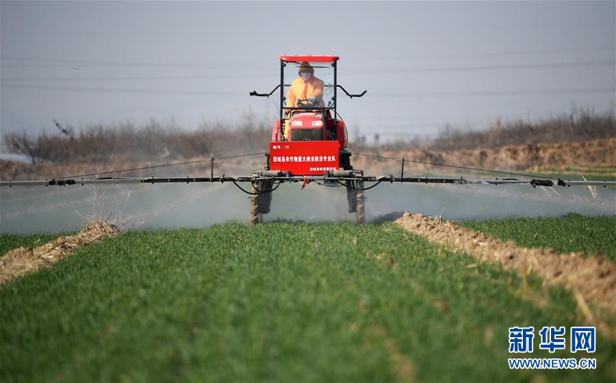 3月4日,建建農(nóng)機合作社社員在蒲城縣椿林鎮(zhèn)平峨村駕駛自走式高桿噴霧機為小麥噴灑除草殺菌劑。近日,為確保疫情期間不誤農(nóng)時,陜西省蒲城縣植保植檢站組織縣內(nèi)7家農(nóng)作物病蟲害專業(yè)化防治單位,在小麥返青起身期,對麥田進行除草及病蟲害的防控工作。新華社記者李一博攝