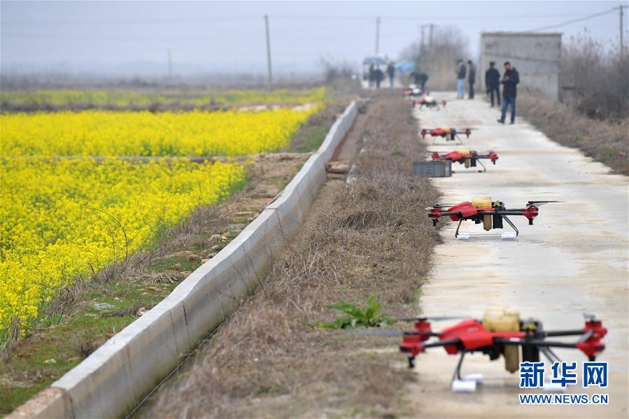 在江西省南昌市南昌縣蔣巷鎮(zhèn),無(wú)人機(jī)準(zhǔn)備起飛對(duì)油菜田進(jìn)行植保作業(yè)(2月28日攝)。新華社記者 彭昭之 攝