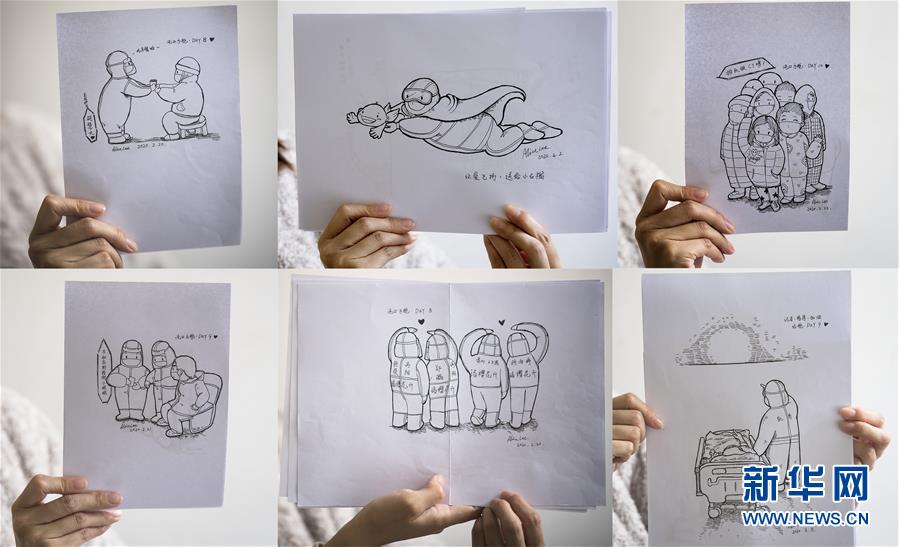 3月13日,黎婧展示自己在疫情期間創(chuàng)作的插畫(huà)(拼版照片)。 3月12日,插畫(huà)師黎婧和84位病友離開(kāi)自己居住的武漢軟件工程職業(yè)學(xué)院康復(fù)驛站,回到自己家中。他們都是治愈出院的新冠病毒肺炎患者,已經(jīng)在武漢軟件工程職業(yè)學(xué)院康復(fù)驛站進(jìn)行了14天醫(yī)學(xué)觀(guān)察,達(dá)到醫(yī)學(xué)標(biāo)準(zhǔn),成功解除隔離。他們由專(zhuān)車(chē)運(yùn)送至所屬社區(qū)附近的集散點(diǎn)后,在社區(qū)工作人員的陪同下回家。 新華社記者 肖藝九 攝