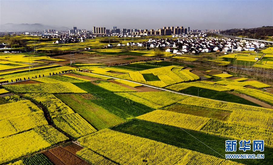 3月14日,洋縣龍亭鎮(zhèn)柳山村盛開的油菜花與村舍構(gòu)成美麗的圖畫(無人機(jī)照片)。 新華社記者陶明攝
