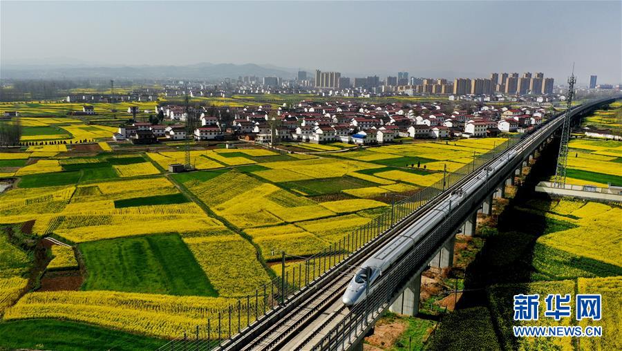 3月14日,一列動(dòng)車從洋縣油菜花海中駛過(無人機(jī)照片)。 近日,秦嶺南麓的陜西省漢中市洋縣14萬畝油菜花競相開放,美景如畫。 新華社記者陶明攝