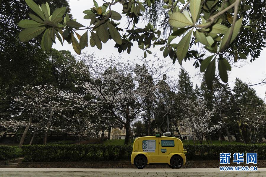 一輛5G無人攝像車在武漢大學(xué)櫻花大道進行不間斷無人巡游,實時采集和傳輸直播圖像信號(3月16日攝)。新華社記者費茂華攝