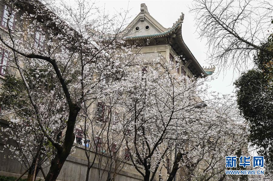 近日,隨著氣溫上升,武漢大學(xué)圖書館附近一片櫻花開放。新華社記者費茂華攝