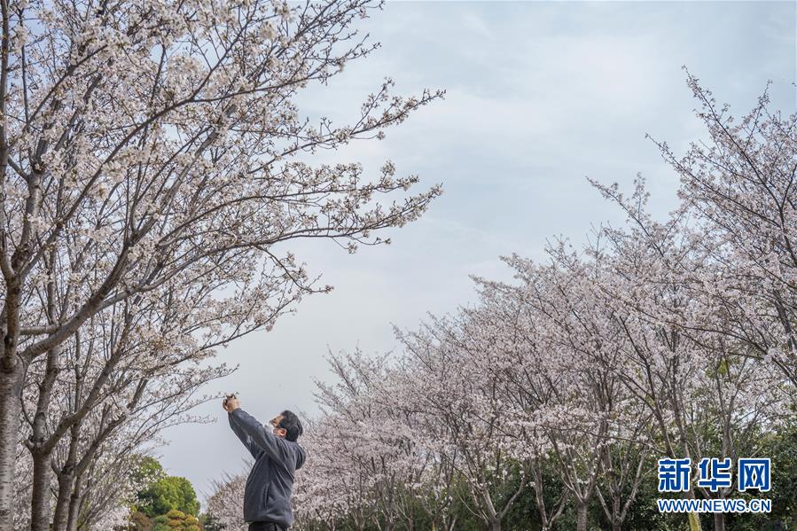 3月19日,在武漢市武昌區(qū)被網(wǎng)友稱為“武漢最美停車場(chǎng)”的湖北日?qǐng)?bào)停車場(chǎng),一名工作人員在拍攝櫻花。 新華社記者 才揚(yáng) 攝
