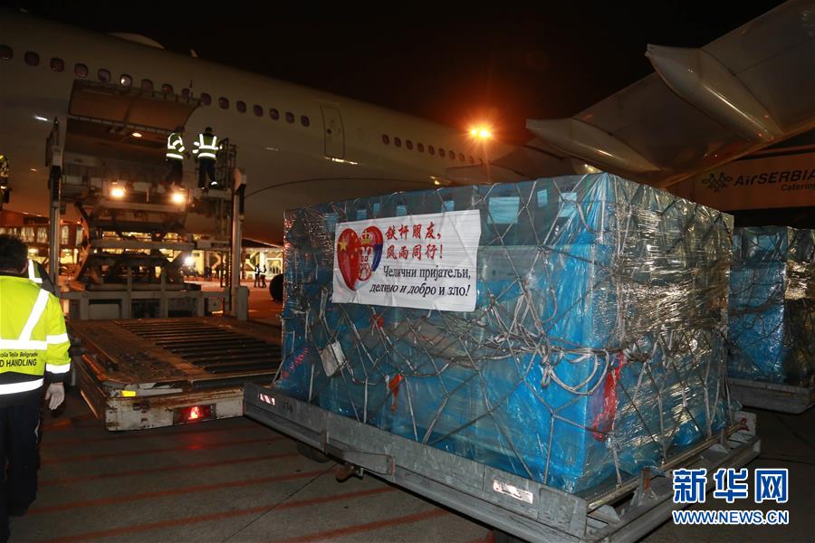 3月21日,在塞爾維亞首都貝爾格萊德,寫有 “鐵桿朋友,風雨同行”字樣的中方捐贈醫(yī)療物資從飛機上卸下。 中國援助塞爾維亞抗疫醫(yī)療專家組一行6人21日晚乘專機抵達塞首都貝爾格萊德,由中國政府捐贈的一批醫(yī)療物資同機抵達。 新華社記者 石中玉 攝