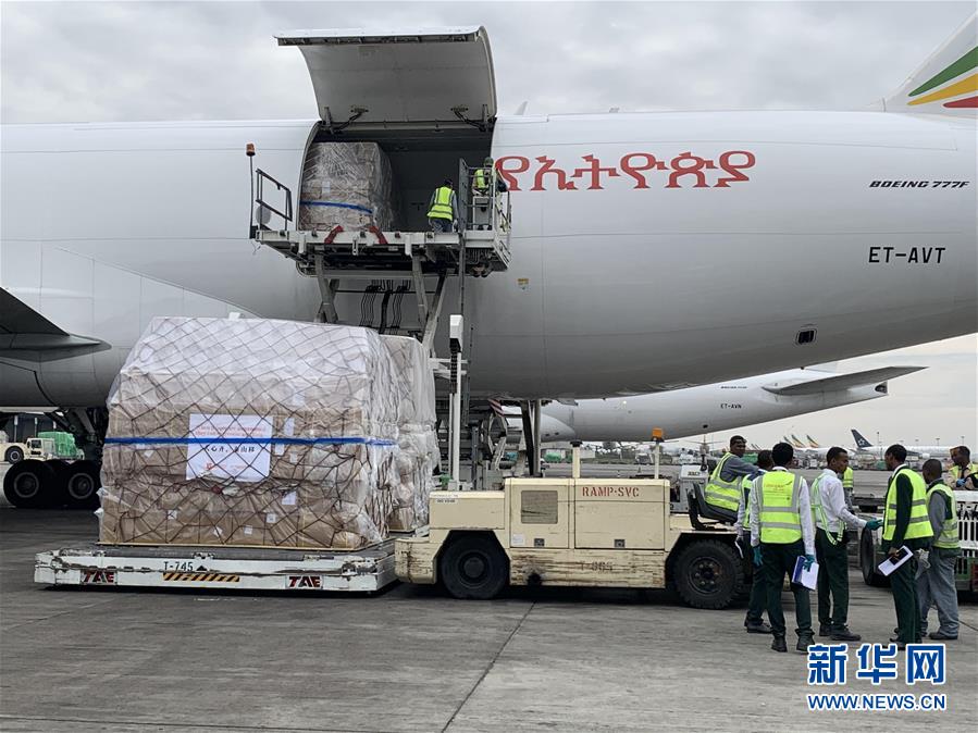 3月22日,在埃塞俄比亞首都亞的斯亞貝巴國際機(jī)場,工作人員將中國援助的抗疫物資運(yùn)下飛機(jī)。歷時(shí)10小時(shí)飛行,滿載著來自中國抗疫物資的埃航貨運(yùn)包機(jī)22日上午抵達(dá)埃塞俄比亞首都亞的斯亞貝巴的國際機(jī)場,這是馬云公益基金會(huì)和阿里巴巴公益基金會(huì)捐贈(zèng)非洲的部分醫(yī)療物資,用于支援非洲54國抗擊疫情。新華社記者王守寶攝