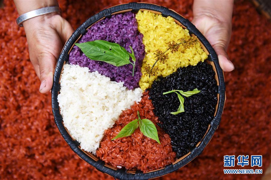 每年農(nóng)歷三月十五前后,貴州省黔東南苗族侗族自治州臺江縣苗族同胞有制作“姊妹飯”、喜迎姊妹節(jié)的習(xí)俗。“姊妹飯”是使用不同植物的樹葉或花朵碾壓成汁液作為原色,對糯米進(jìn)行浸泡并蒸熟的五彩糯米飯。姊妹節(jié)期間,青年男子可以向心儀的姑娘討要“姊妹飯”,姑娘們則通過贈送藏有不同物品的“姊妹飯”傳情達(dá)意。