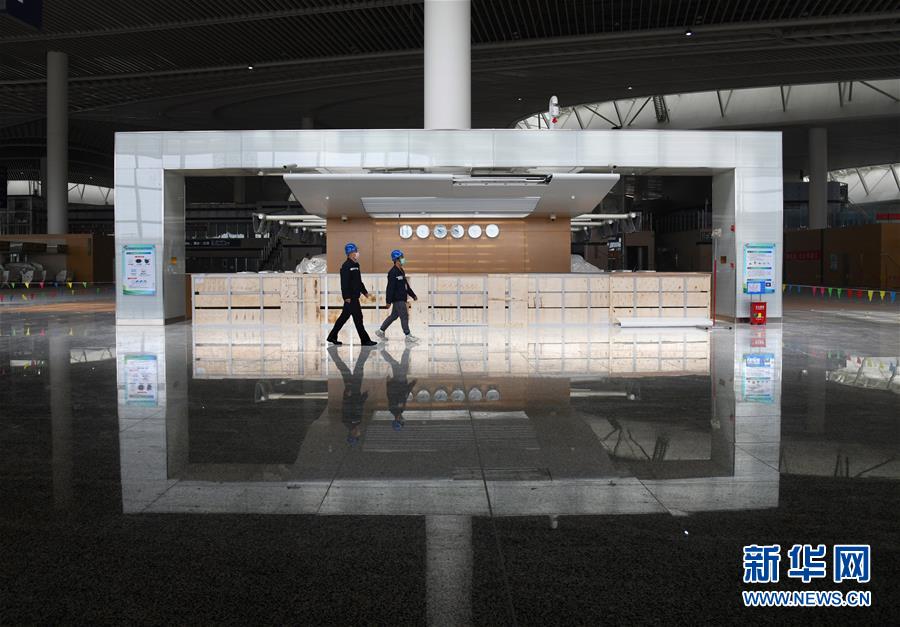 3月25日,兩名工人從建設(shè)中的青島膠東國際機(jī)場(chǎng)航站樓出發(fā)大廳走過。新華社記者李紫恒攝