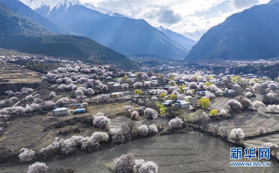 西藏林芝市波密縣境內(nèi)桃花盛開的田園風(fēng)光(無人機(jī)照片,3月26日攝)。新華社記者 晉美多吉 攝