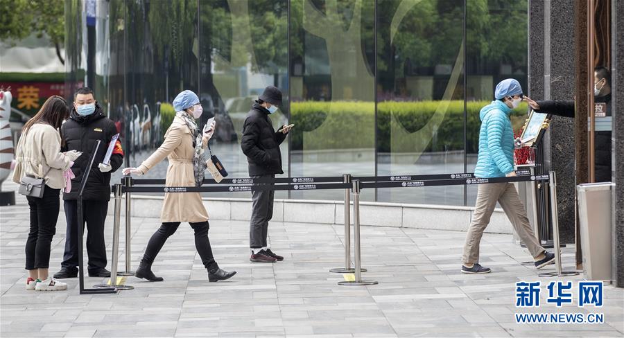 3月30日,顧客排隊進入武商國際廣場。當日,武漢市多家商場開門迎客。新華社記者費茂華攝