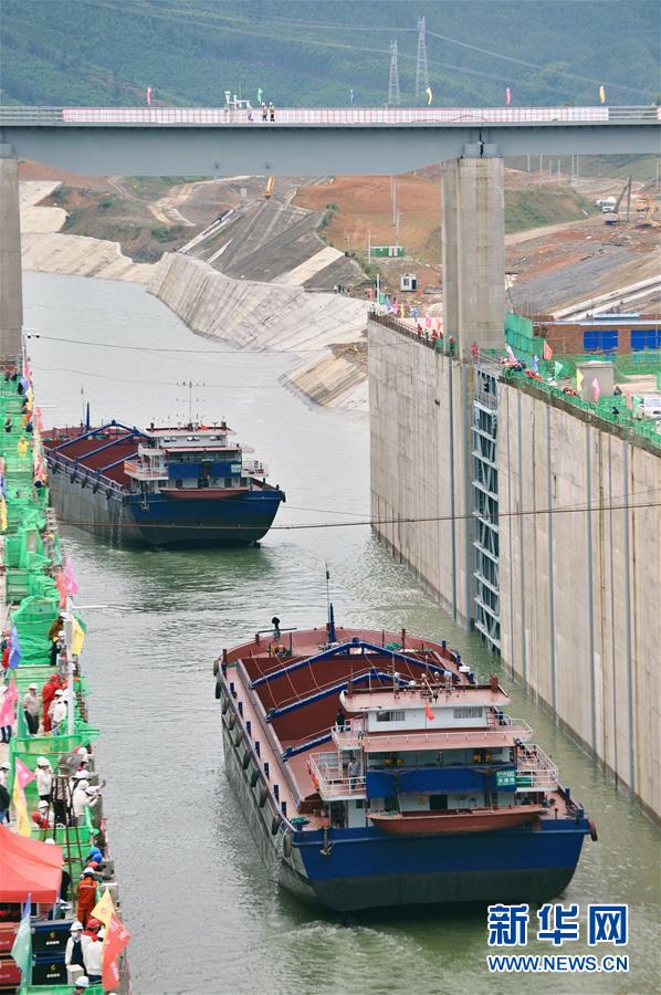 3月31日,船只駛入大藤峽水利樞紐工程船閘閘室。新華社記者崔博文攝