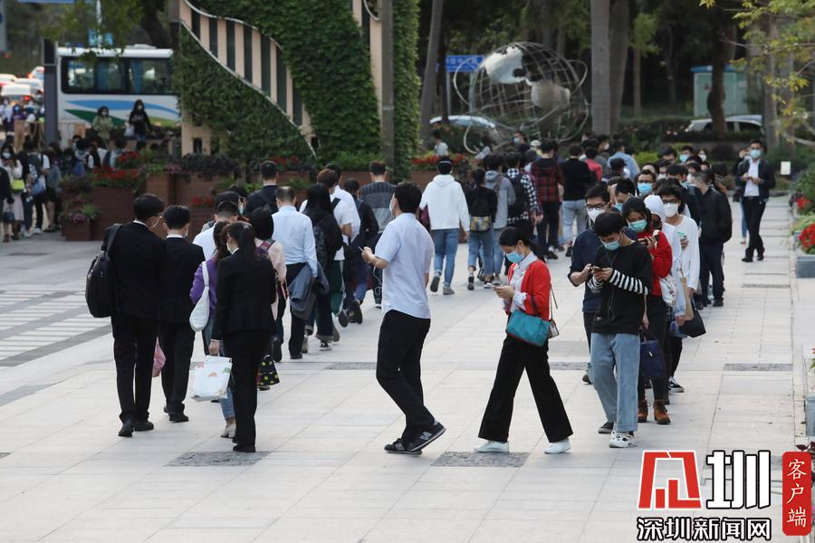 由于下班高峰客流量較大,“人龍”排到一旁的科技園文化廣場,形成“蛇餅”隊伍,秩序卻十分井然。