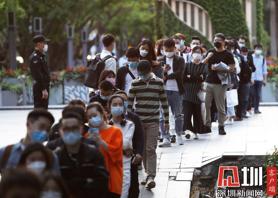 見圳客戶端·深圳新聞網(wǎng)2020年3月19日訊 下班時間,深圳地鐵一號線深大站A3出口外,下班后的市民在站外排大排長龍,依次有序進(jìn)入地鐵站乘坐列車回家。