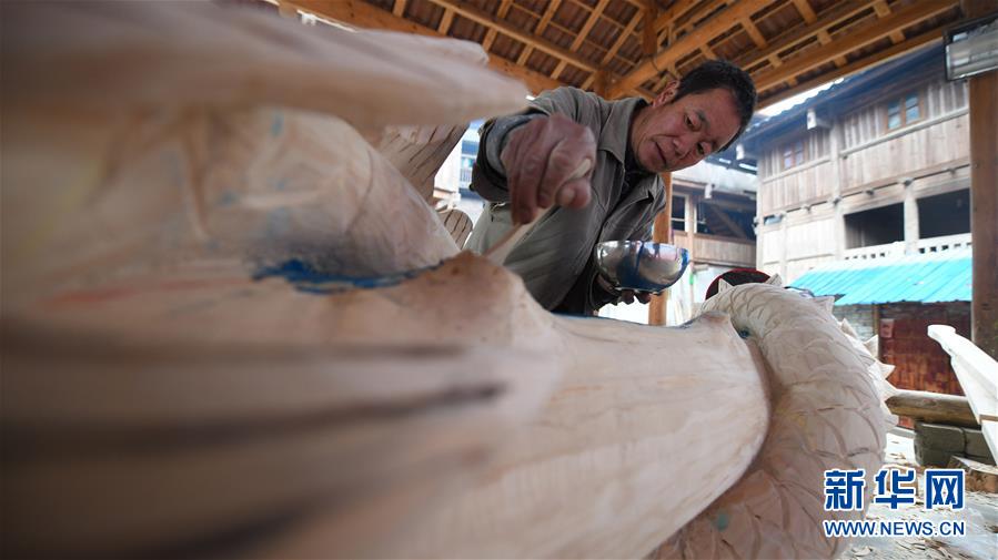烏英苗寨村民給新蘆笙柱涂油漆(12月20日攝)。新華社記者黃孝邦攝