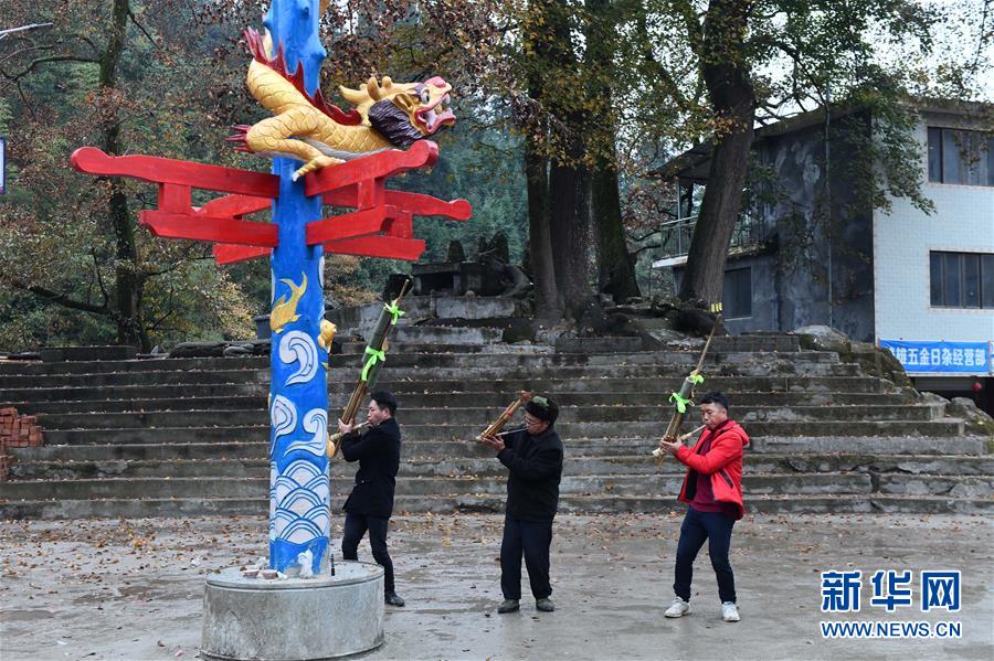 在烏英苗寨新蘆笙柱下,融水苗族自治縣苗族蘆笙音樂(lè)代表性傳承人梁安合(中)在練習(xí)吹蘆笙(12月24日攝)。新華社記者王諾攝