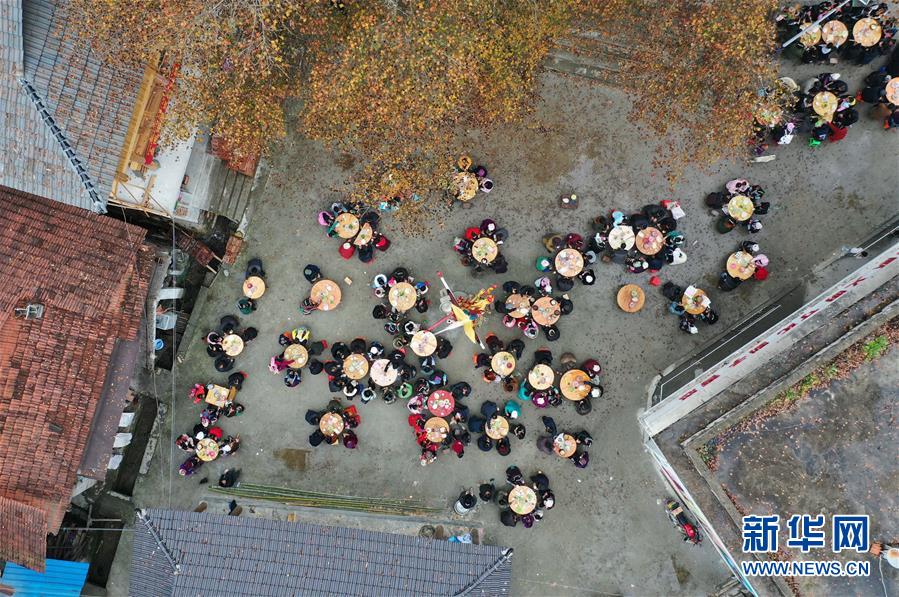 烏英苗寨村民在新蘆笙柱下吃百家宴(12月22日無(wú)人機(jī)拍攝)。新華社記者黃孝邦攝