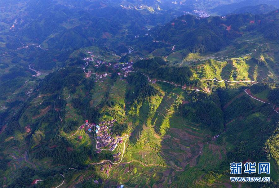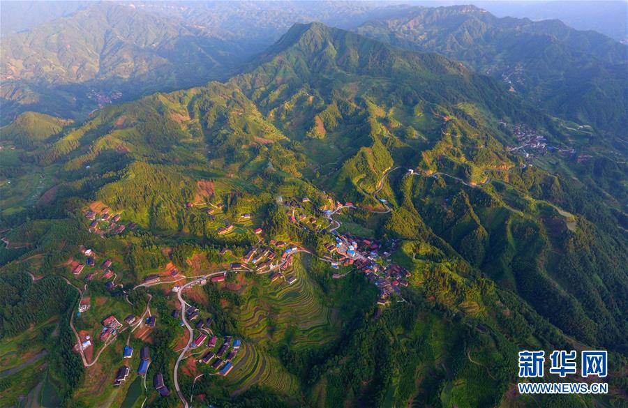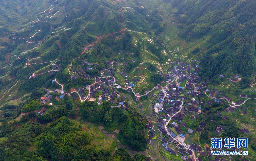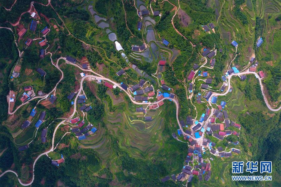 在融水苗族自治縣桿洞鄉(xiāng)黨鳩村下黨鳩屯,道路已經(jīng)修到家家戶戶門(mén)前(6月21日無(wú)人機(jī)拍攝)。新華社記者黃孝邦攝