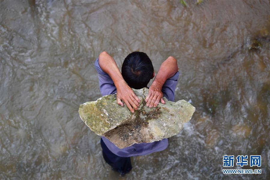 村民在烏英苗寨搬運(yùn)石頭,維修河堤(7月2日攝)。