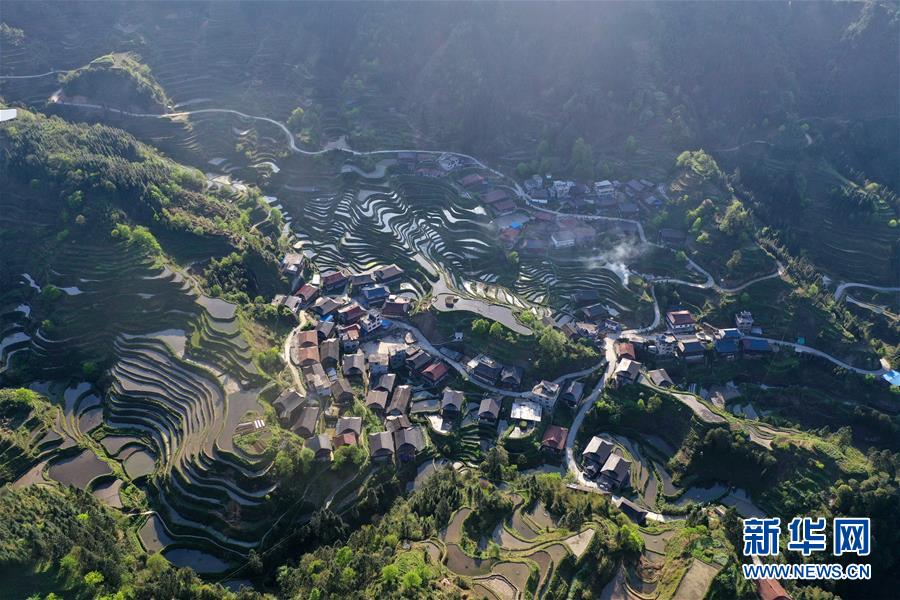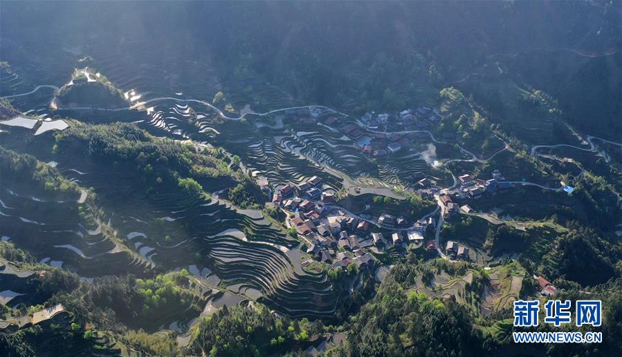 這是融水苗族自治縣桿洞鄉(xiāng)小河村高羽苗寨的木樓和梯田(3月31日攝,無(wú)人機(jī)照片)。新華社記者黃孝邦攝