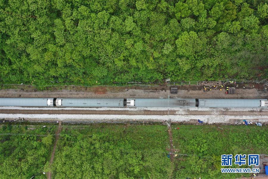 4月1日,Z201次旅客列車通過(guò)京廣鐵路郴州段脫軌事故區(qū)段(無(wú)人機(jī)照片)。新華社記者李尕?cái)z