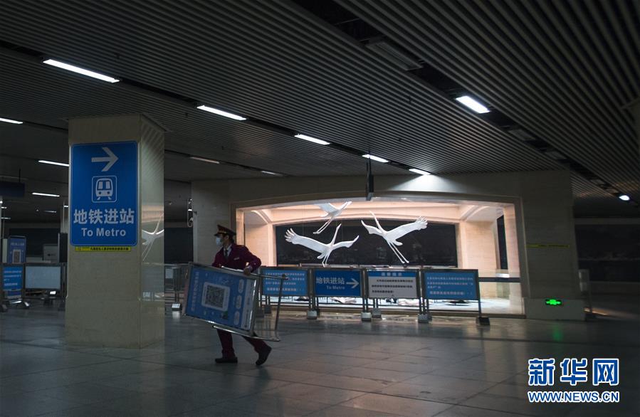 3月23日,在漢口火車站地鐵站,工作人員將進(jìn)站的二維碼牌搬運至進(jìn)站口。新華社記者肖藝九攝